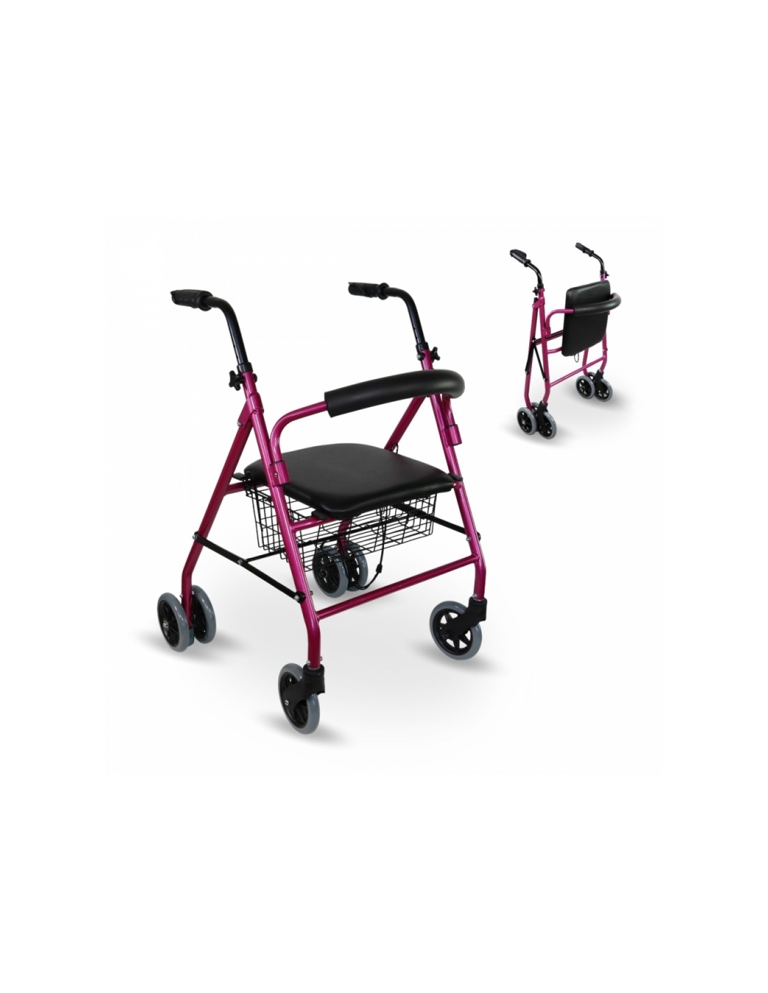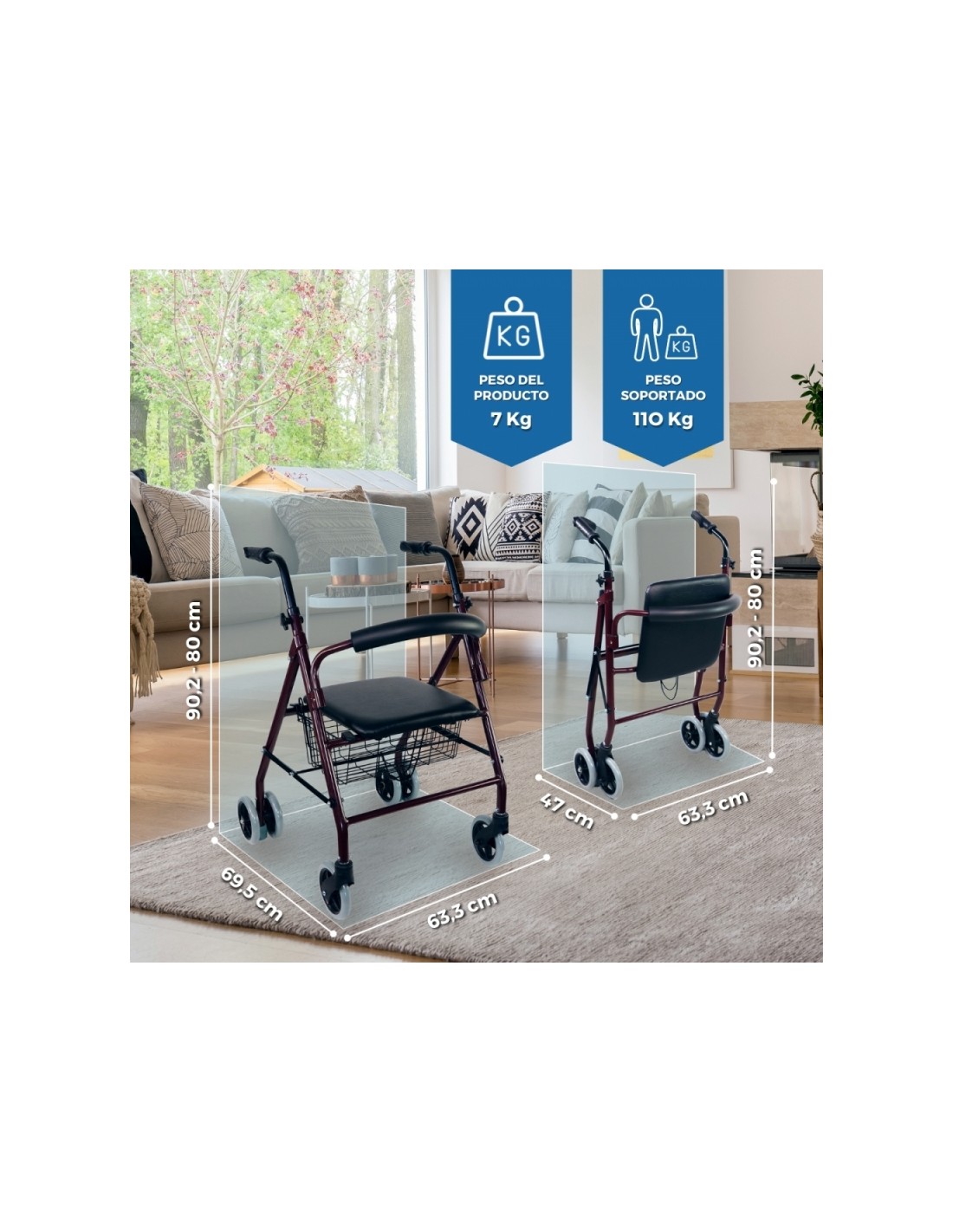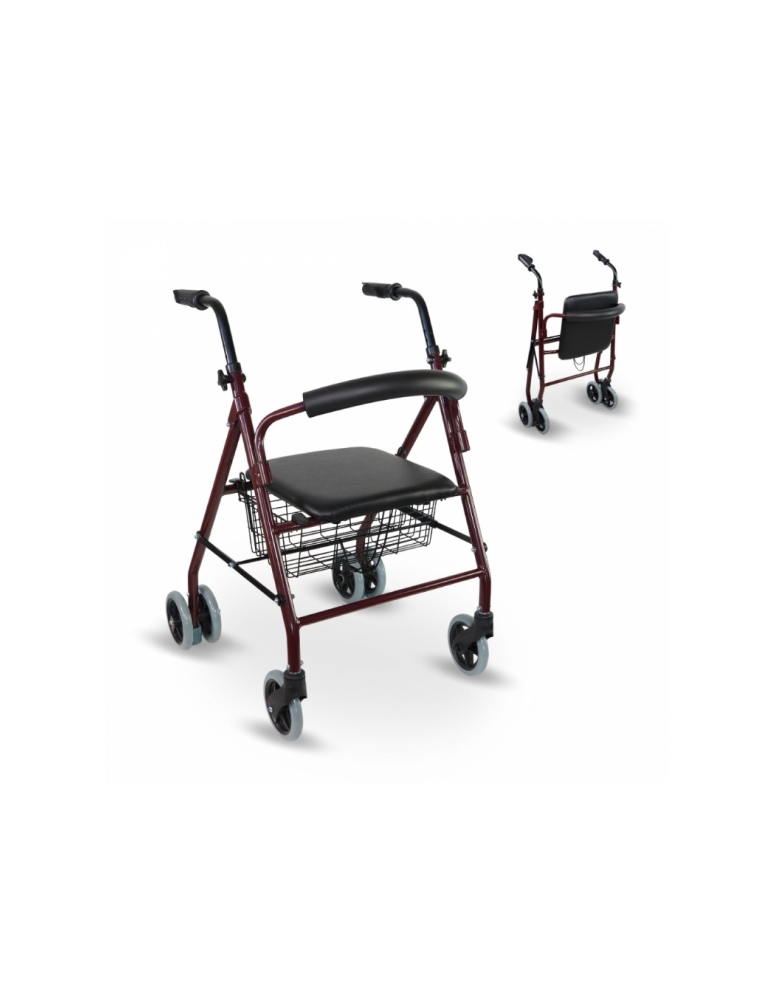 Andador plegable y regulable de aluminio con asiento, respaldo y cesta | Prado | Granate
