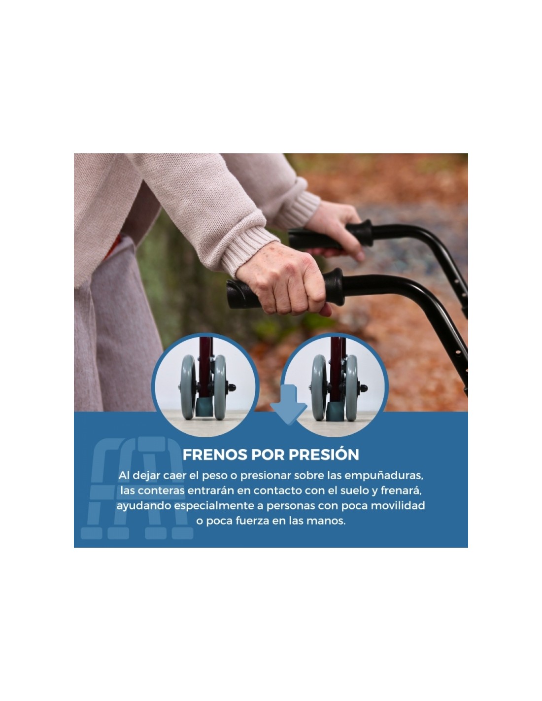 SEGURO: este andador para adultos dispone de frenos por presión, que se accionan fácilmente al ejercer fuerza sobre las empuñaduras del andador con ruedas. Este modelo ayuda a prevenir las caídas dándole al usuario una gran seguridad para que pueda desplazarse con tranquilidad y ganando autonomía e independencia.