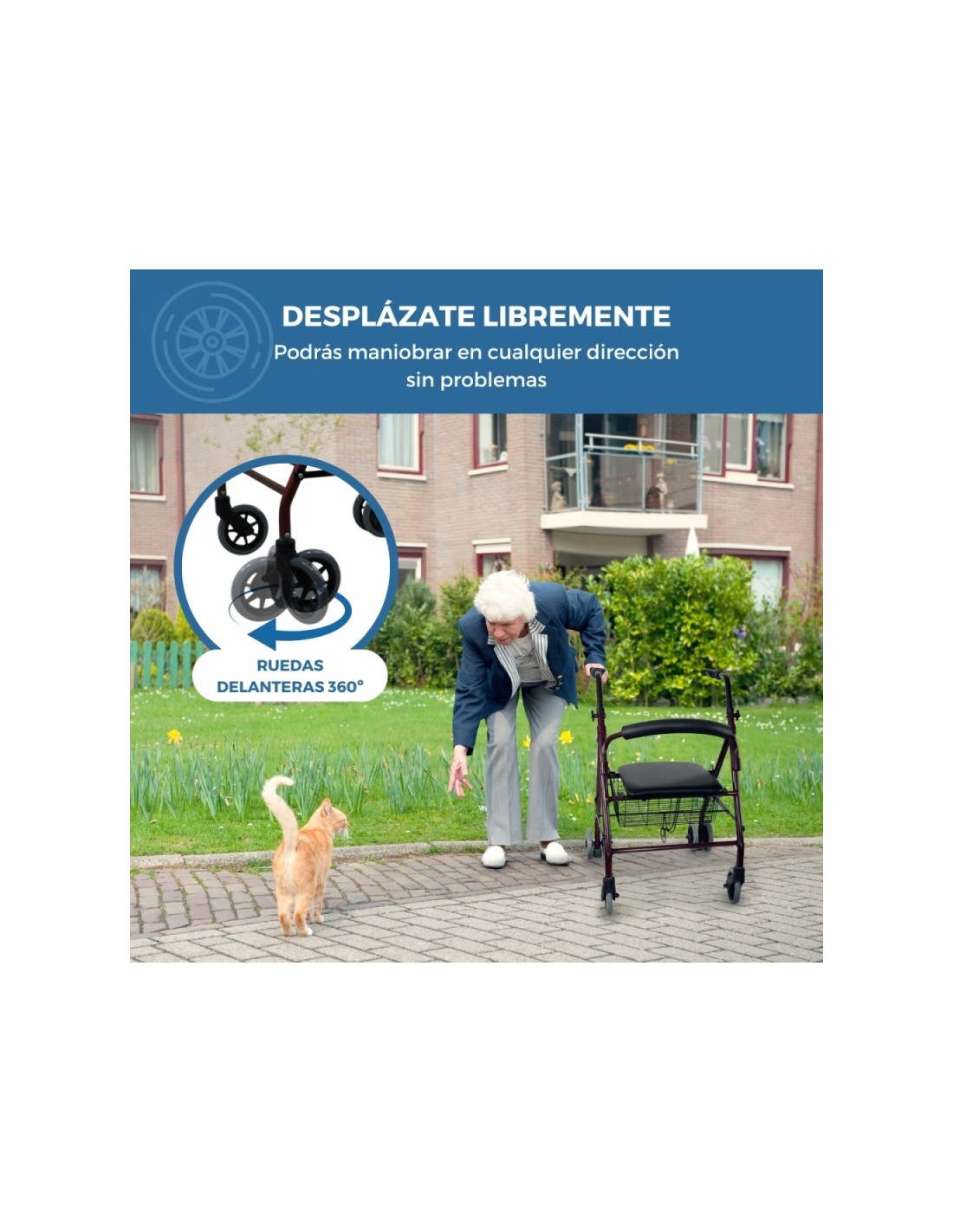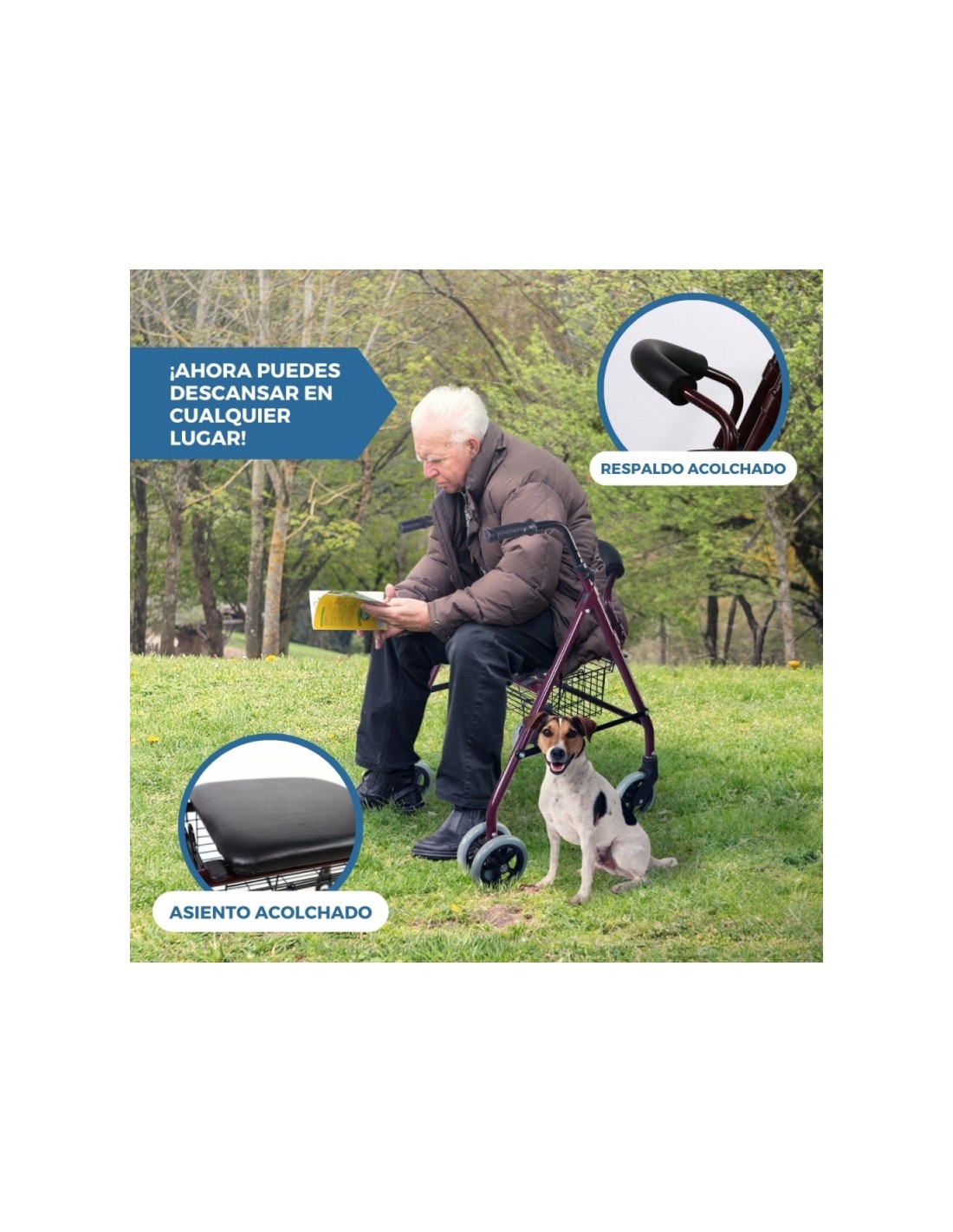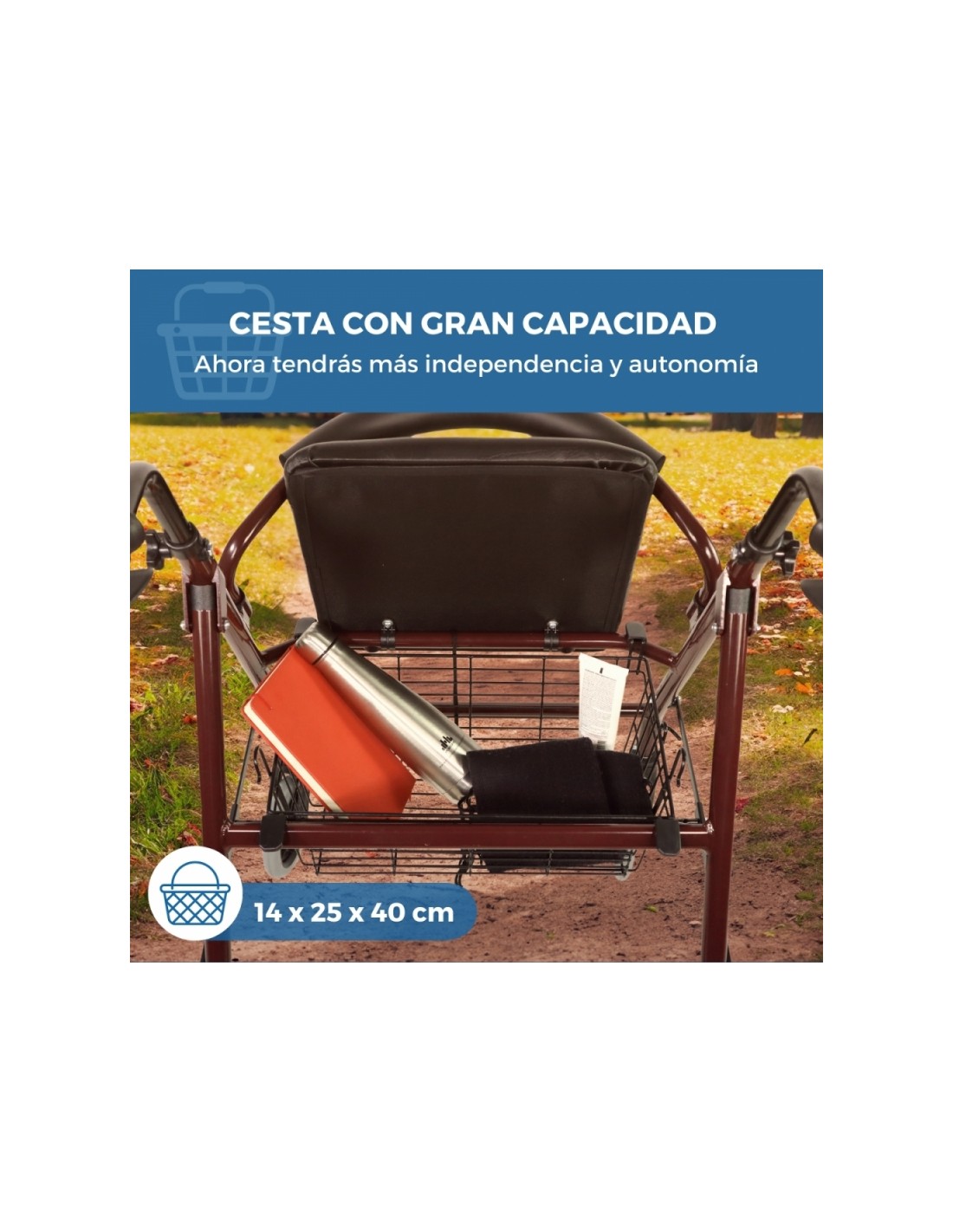 Andador de aluminio plegable y regulable con asiento, respaldo y cesta | Prado GRANATE | Diferentes colores