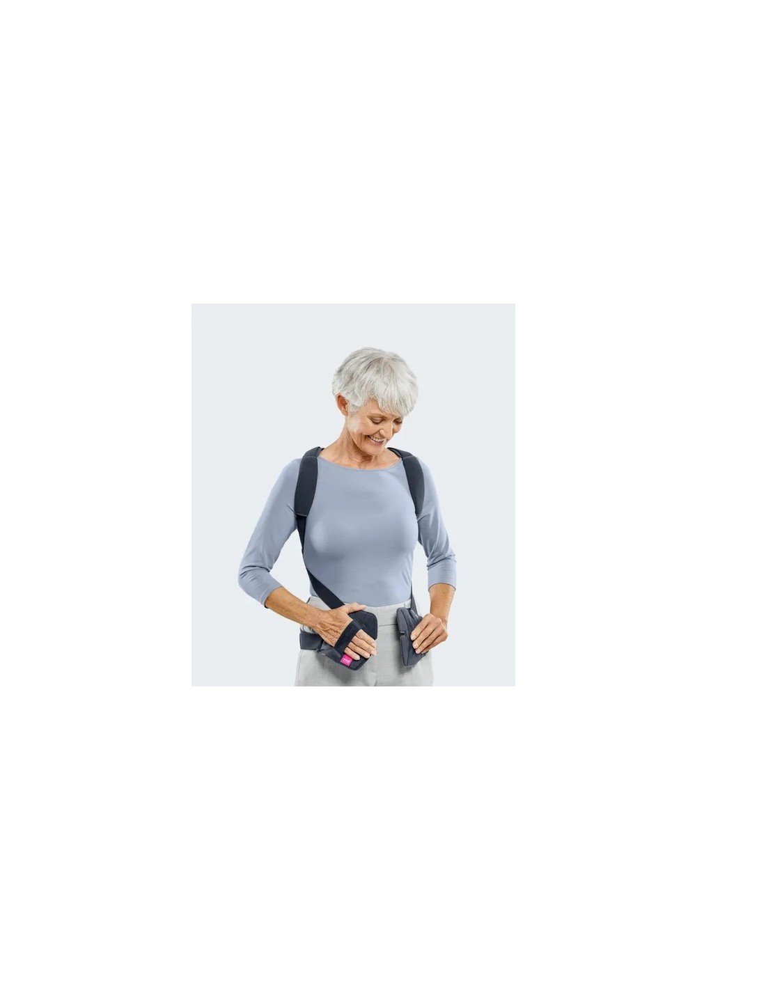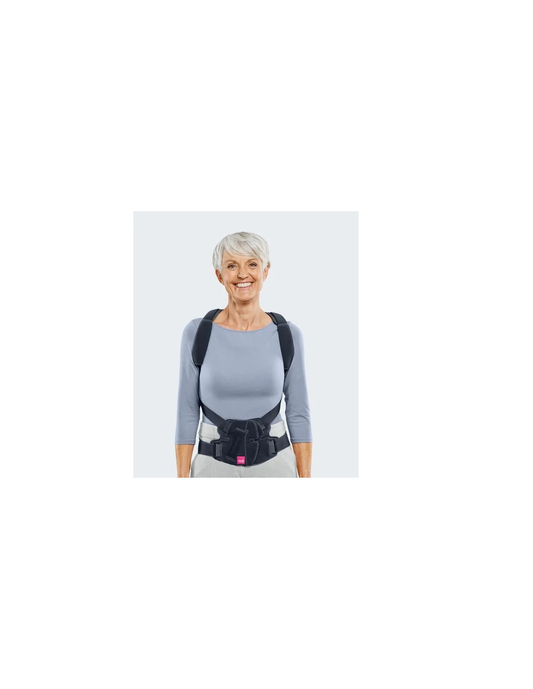 Ortesis de espalda Spinomed para la extensión vertebral en caso de osteoporosis y fortalecimiento de la musculatura del tronco, puede ajustarse individualmente a la curvatura de la espalda y a la masa corporal. Gracias a sus tirantes ergonómicos, la ortesis se coloca tan fácilmente como una mochila ligera.