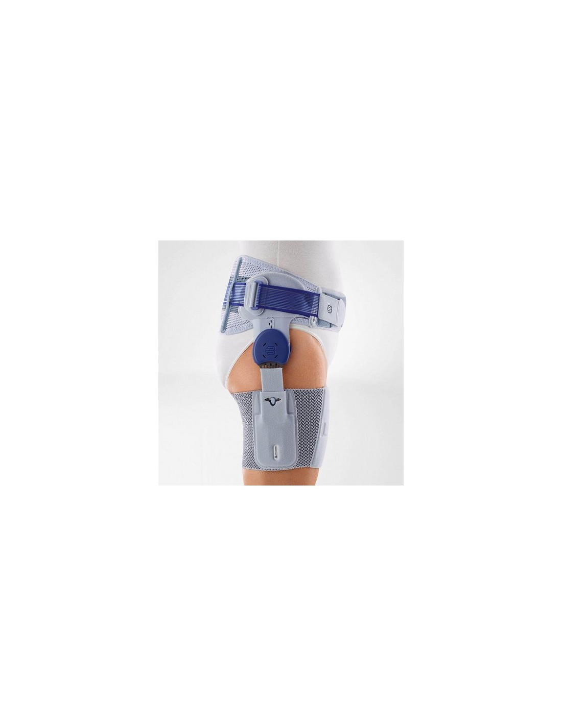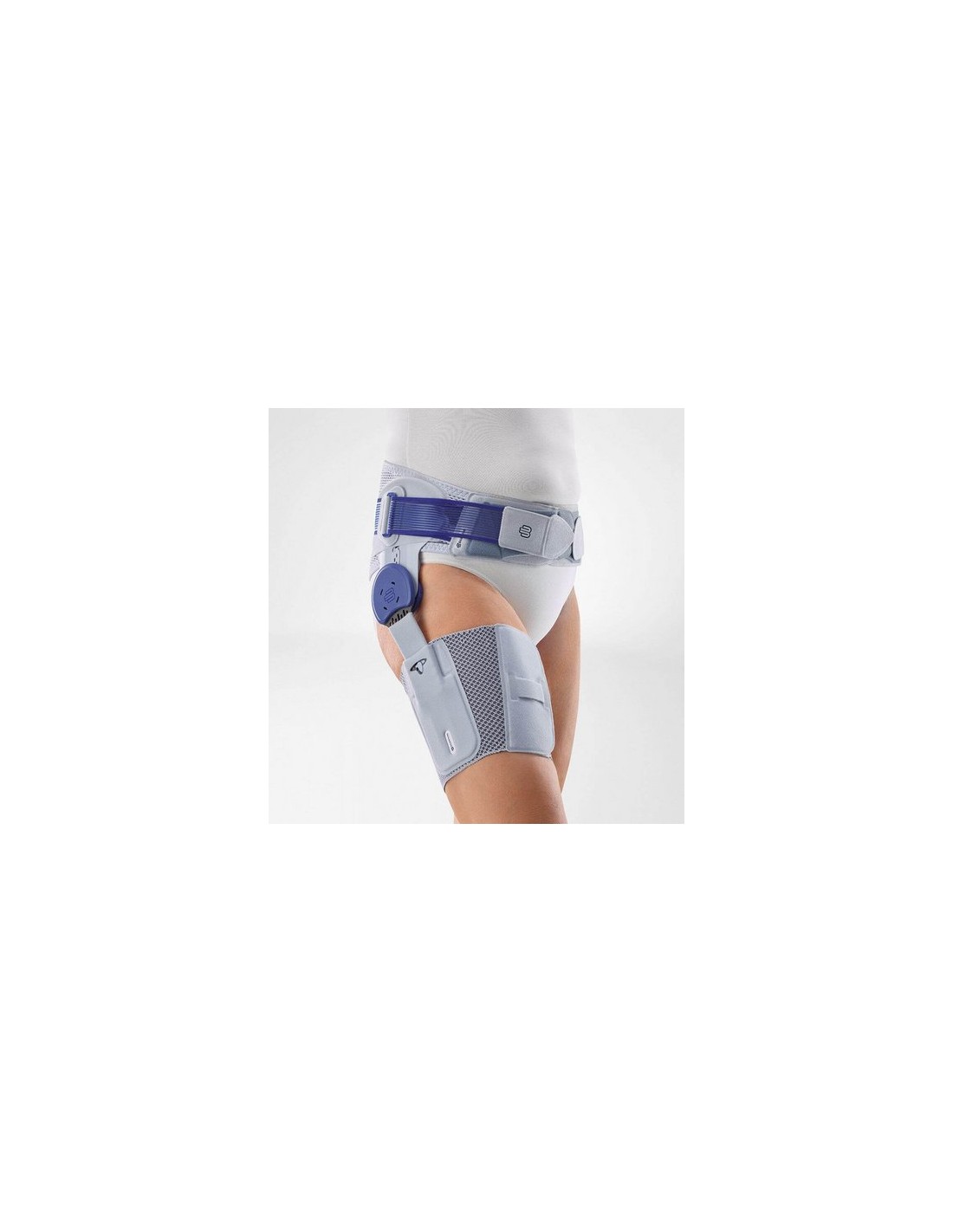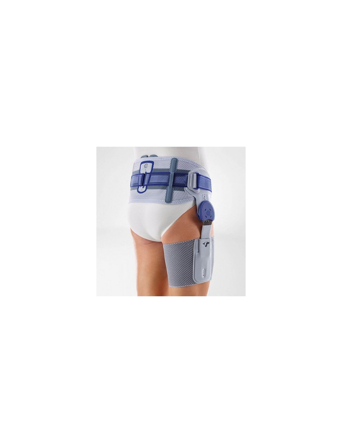 Se trata de un vendaje ajustable de material elástico y transpirable que envuelve el anillo pélvico, y otro vendaje que envuelve el muslo. Los dos están conectados por una pletina articulada plana de apoyo, fabricada en aluminio. Esto sirve de guía y acompaña el movimiento de la pierna al caminar. Si es necesario, también puede utilizarse para limitar el margen de movilidad a la parte delantera y/o trasera. Dos elementos acolchados especiales (almohadillas) masajean la transición de la columna lumbar a la pelvis. Otra almohadilla, llamada Trochanter Pad, se mueve arriba y abajo sobre el trocánter mayor (protuberancia del hueso del muslo) al caminar. De este modo, actúa sobre los arranques de los tendones y alivia el dolor. Las personas que sufren de dolores en la cadera reconocen un efecto similar cuando presionan este punto con sus dedos para aliviarse. Al mismo tiempo, también se trabaja el aparato sensomotor. La almohadilla Gluteal Pad masajea los puntos de estimulación en la parte superior de la pelvis lateral. Todo esto logra un efecto relajante en los músculos de la cadera.